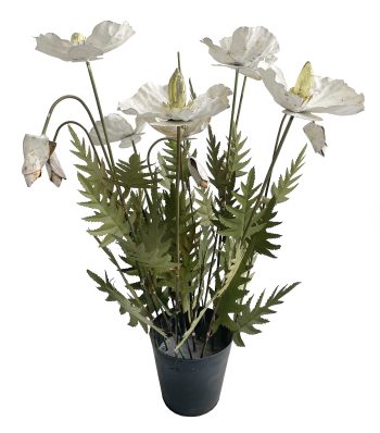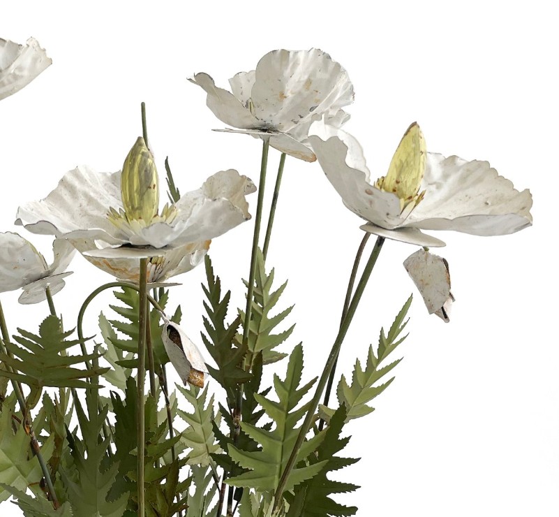 Una pieza que evoca un precioso jardín de amapolas. Una obra botánica de metal que ha sido meticulosamente hecha a mano, pétalo a pétalo. Su silueta delicada y la textura ligeramente envejecida le dan un aire poético y atemporal, como si llevara años floreciendo en el mismo rincón.