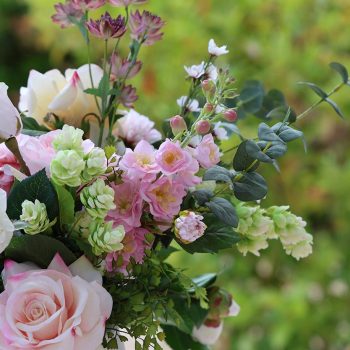 Te presentamos nuestro encantador ramo Amber. Es alegre y elegante. Repleto de rosas en tonos rosa y crema, lúpulo, helleborus, delphinium, flor de cera, tulipanes, dahlias, cultrillo y astrantia, fabricadas en materiales exclusivos que te harán sentir que estás tocando flores recién cortadas. Este arreglo floral te llegará en este precioso jarrón de cerámica blanco. Un ramo ideal para complementar cualquier rincón de tu hogar.