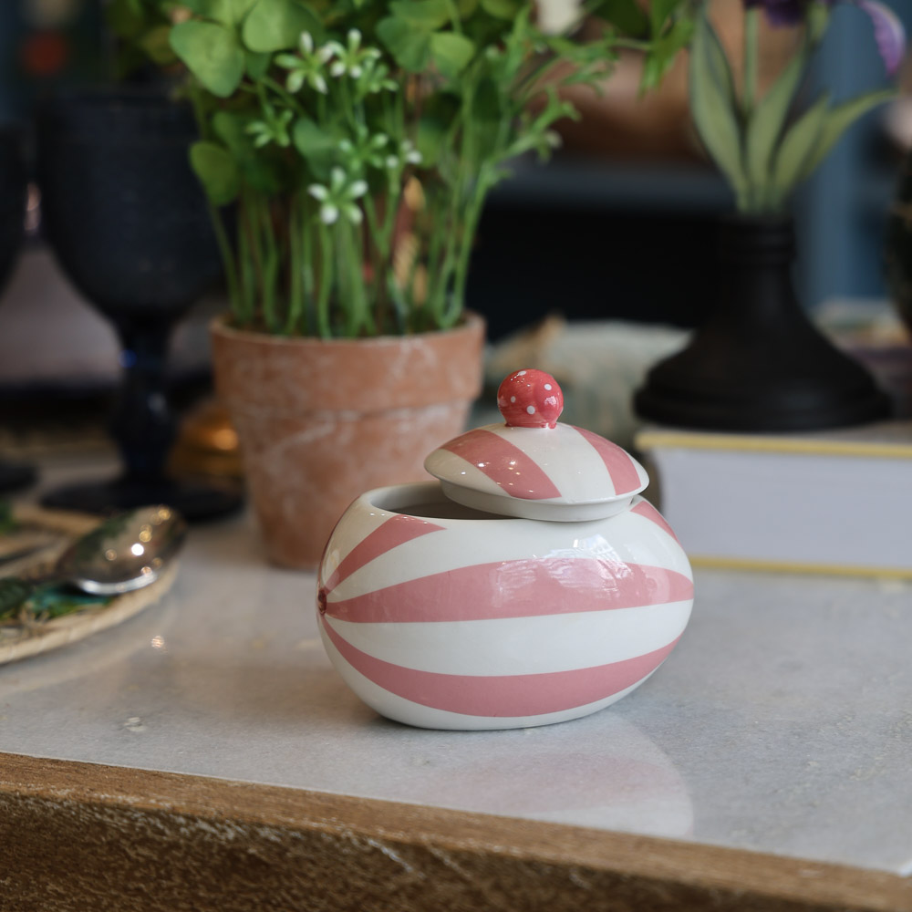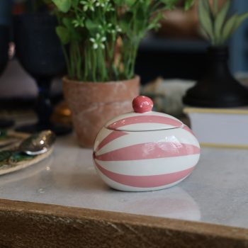 Nuestra Caja de cerámica Circo Rouge está hecha y pintada a mano, con rayas rojas que recuerdan a los carromatos de un circo antiguo y una tapa coronada con una coqueta mariquita. Ideal para guardar pequeños tesoros, huevos de Pascua o dulces.