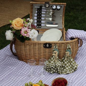 Presentamos la preciosa cesta de picnic Champs d’Été para dos personas. Realizada con mimbre tejido a mano forrado con tela de vichy.