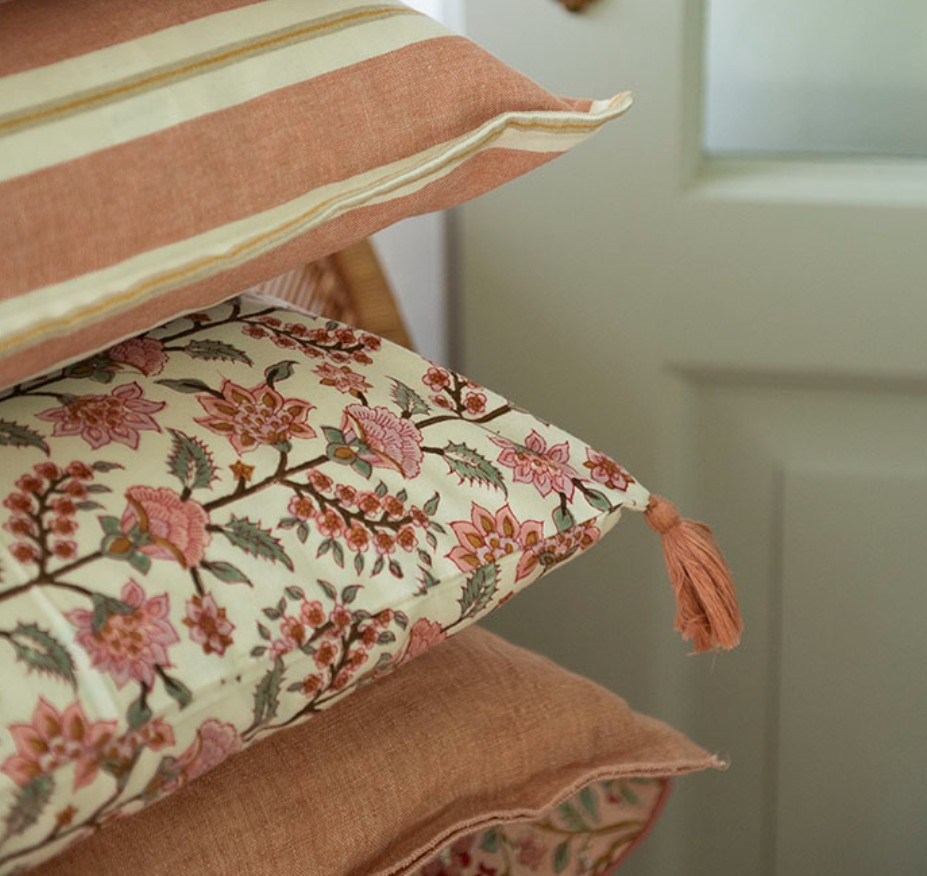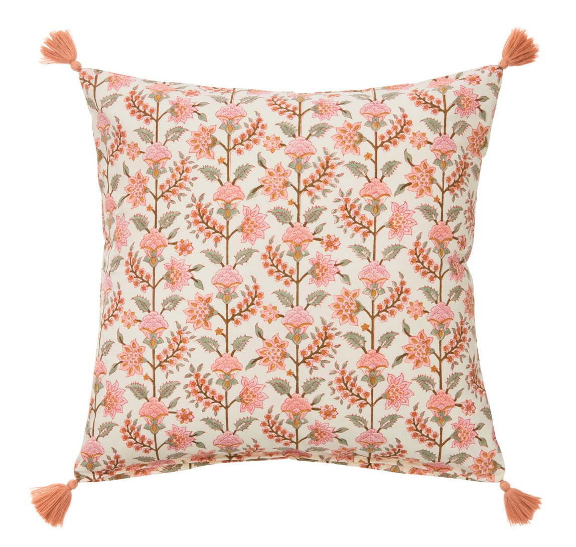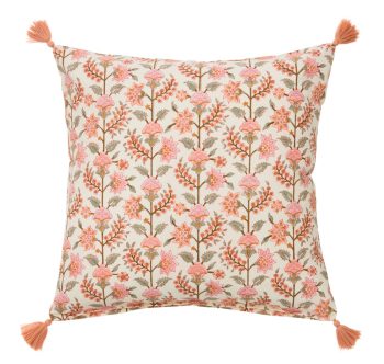 Este precioso cojín de 50 x 50 cm está hecho a mano en 100% algodón, utilizando la tradicional técnica de impresión en bloques. Un proceso artesanal minucioso que da lugar a un encantador estampado floral en tonos rosas, rematado con delicadas borlas en las esquinas. Ideal para dar un toque cálido y especial a cualquier rincón.