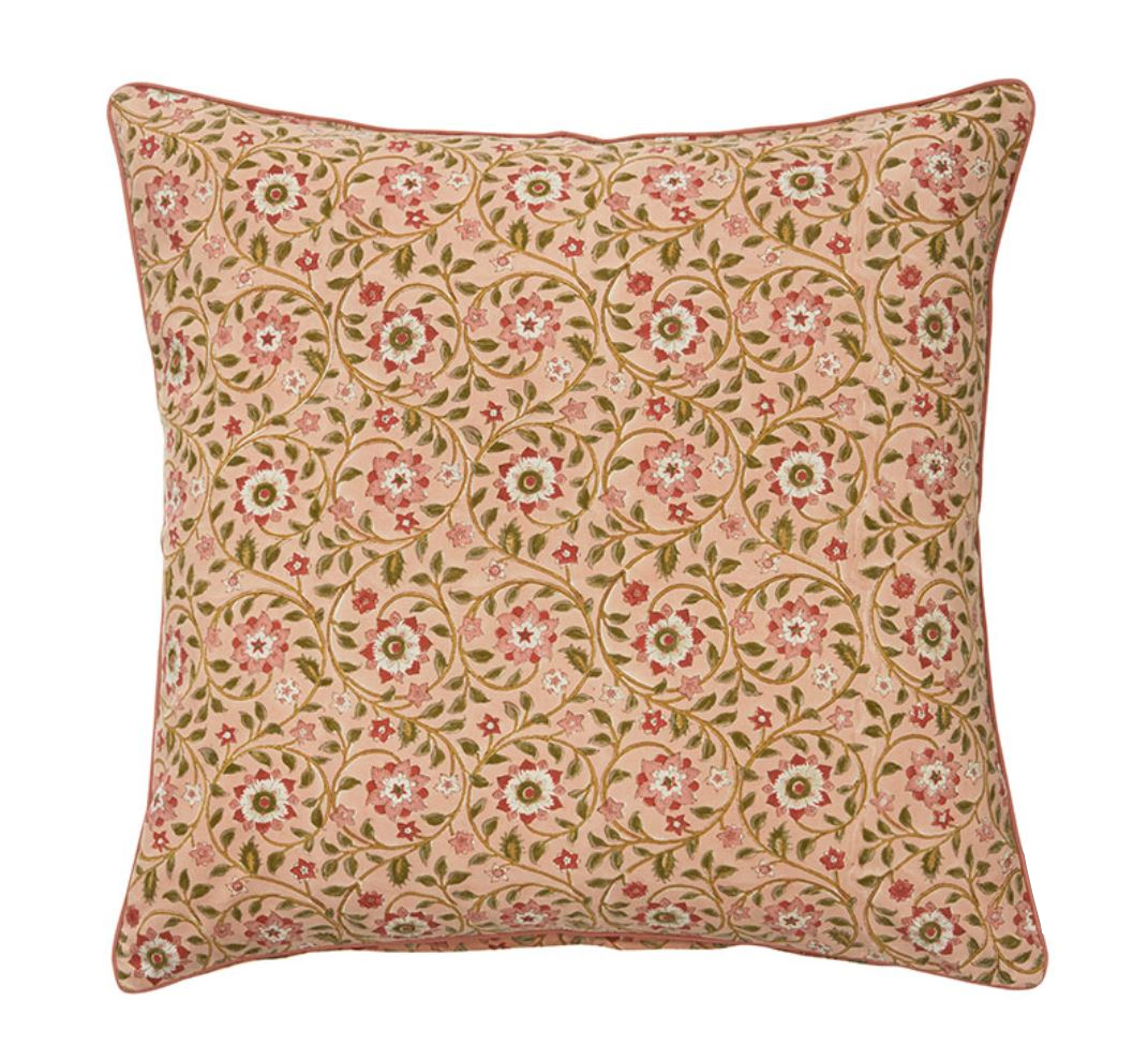 Este cojín de 60 x 60 cm está confeccionado en 100% algodón y estampado a mano mediante la tradicional técnica de block print. Su delicado motivo floral en tonos verdes y rojizos sobre fondo rosa empolvado lo convierte en una pieza especial, ideal para dar calidez y encanto a cualquier rincón. Incluye relleno.
