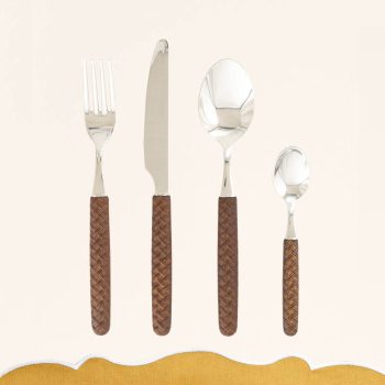 Elegante set de 24 piezas para 6 comensales con un precioso mango efecto cuero trenzado de color chocolate con acero inoxidable italiano de primera calidad. Un toque de elegancia y lujo para tus mesas.