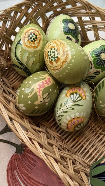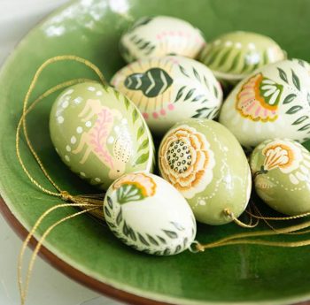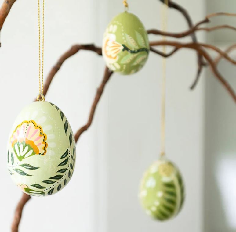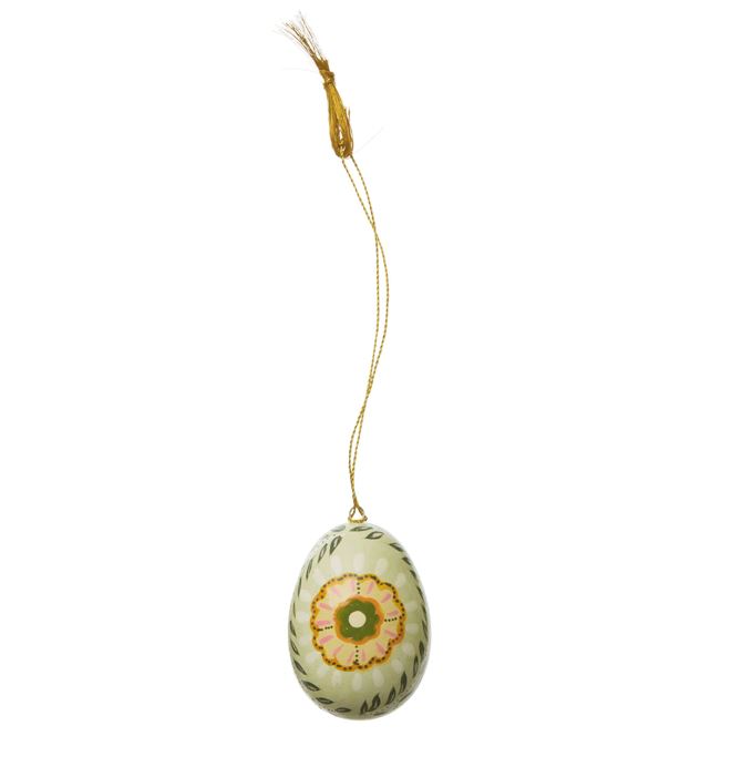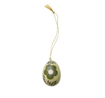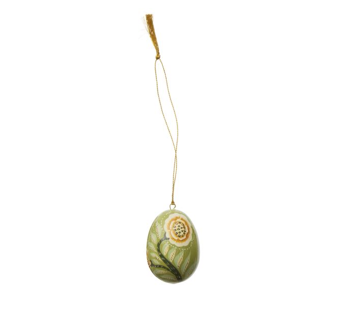 Huevo decorativo verde Laurel: Con una gran flor central en tonos verdes, este huevo es un tributo a la naturaleza. Cada trazo pintado a mano resalta su carácter artesanal y único.
