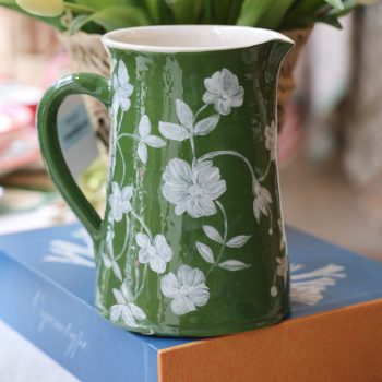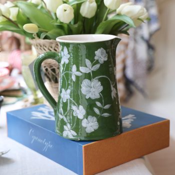 Con sus flores blancas sobre un fondo verde intenso, esta jarra es mucho más que una pieza de cerámica: es una declaración de cariño por lo hecho a mano. Cada una se realiza bajo pedido por artesanas en España, lo que la convierte en una pieza única, imperfectamente perfecta, con alma.