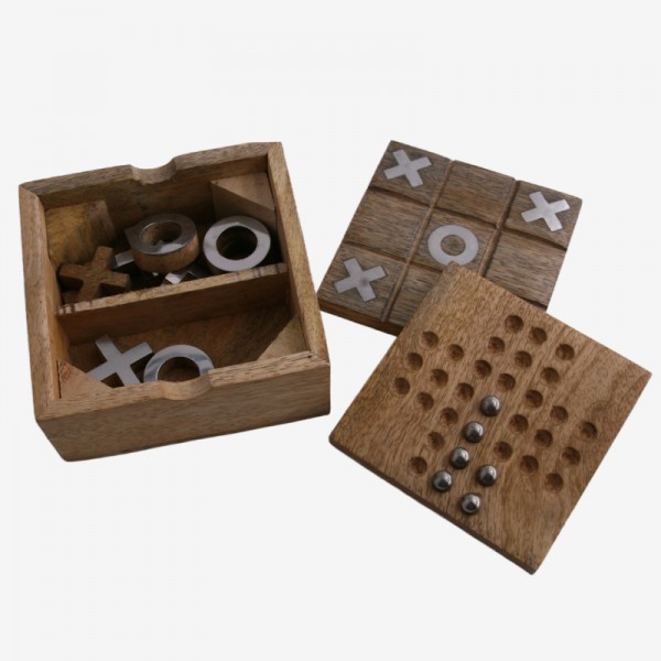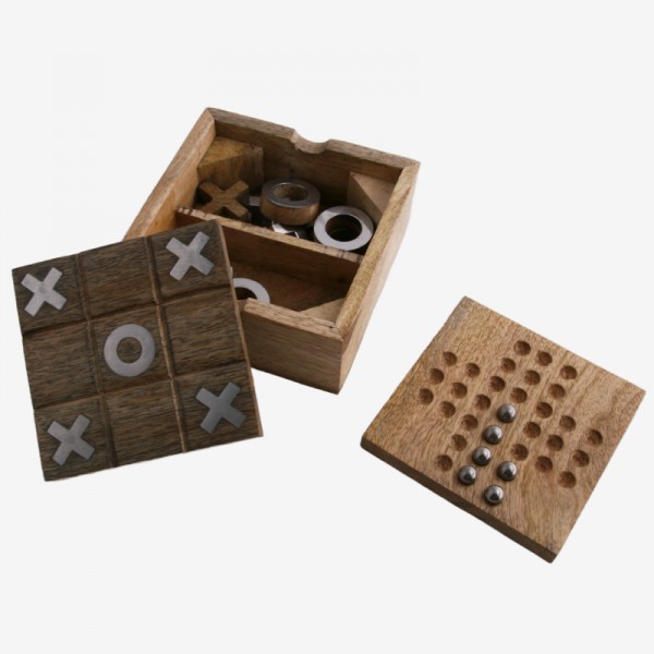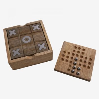 Un pequeño tesoro lúdico en madera natural. Este elegante juego de mesa esconde una doble sorpresa: por un lado, el clásico tres en raya con piezas de metal sobre tablero de madera, y por el otro, un juego de solitario para poner a prueba tu ingenio en los ratos tranquilos.