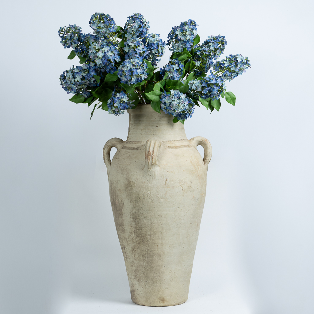 Las flores están agrupadas en racimos densos, que aportan volumen y textura al conjunto, mientras que las hojas verdes y brillantes en la base de cada racimo contrastan de manera elegante con los tonos fríos de las flores. Los tallos son fuertes y flexibles, lo que te permite ajustarlos y moldearlos según tus necesidades decorativas.