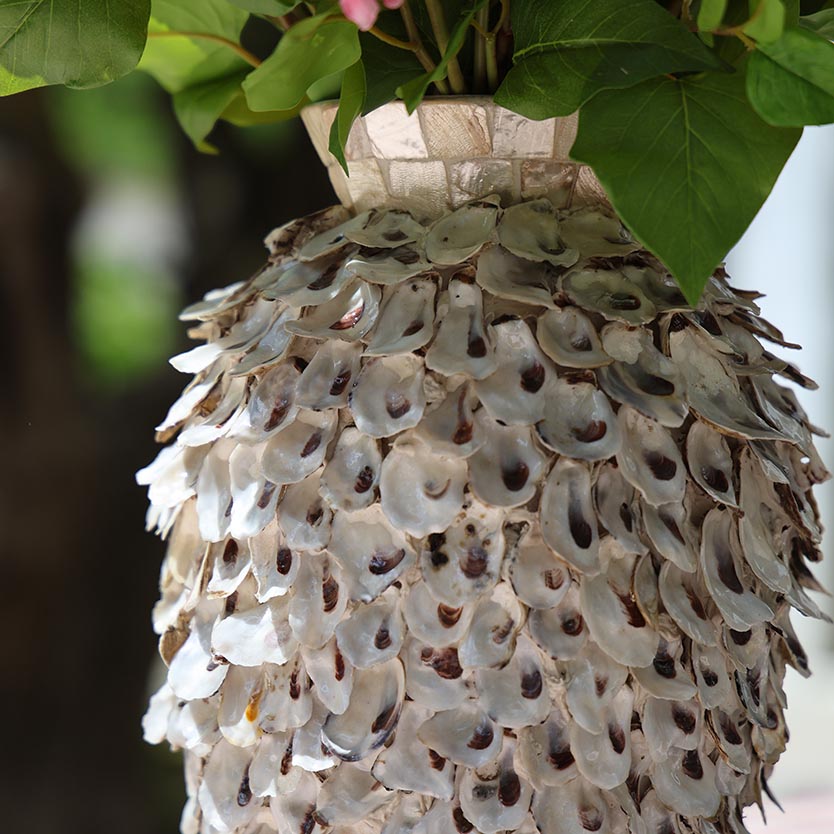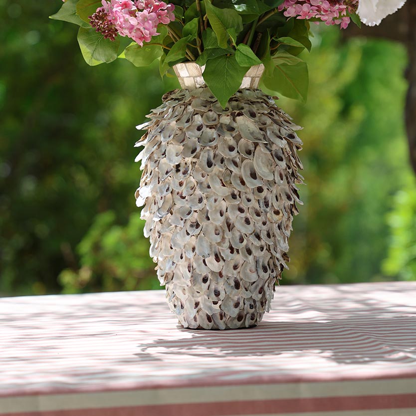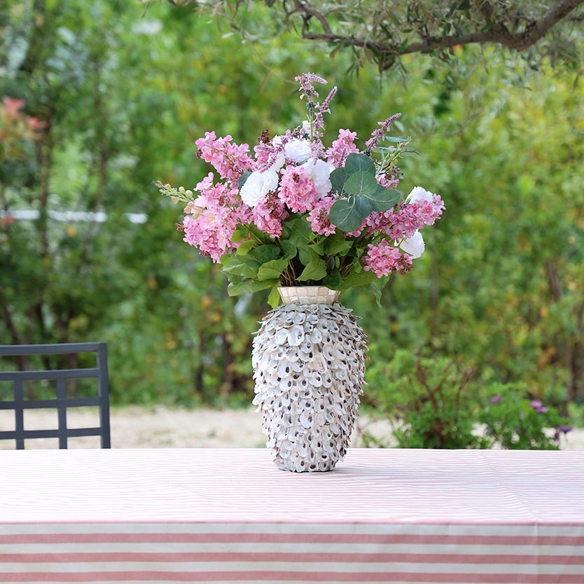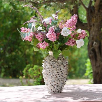 Te presentamos nuestro precioso ramo Lilas des Mers. Repleto de lilas, delphinium, lissthus y lavanda, fabricadas en materiales exclusivos que te harán sentir que estás tocando flores recién cortadas. Este arreglo floral te llegará en este precioso jarrón hecho a mano con delicadas conchas nacaradas. Un ramo ideal para complementar cualquier rincón de tu hogar.