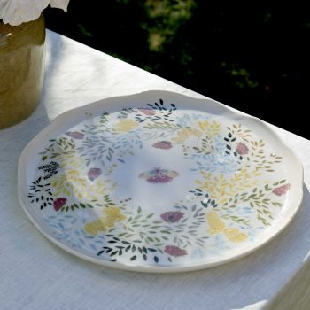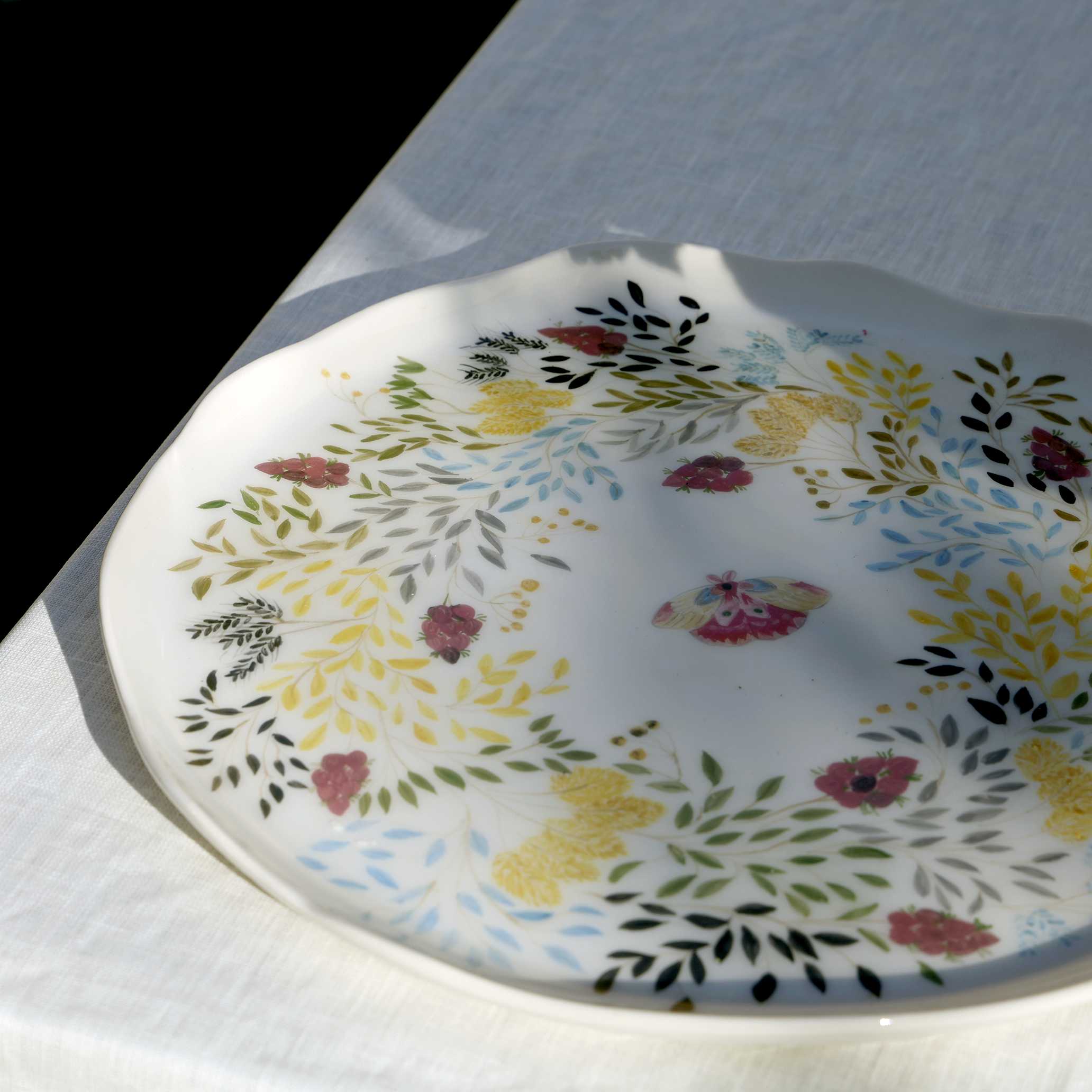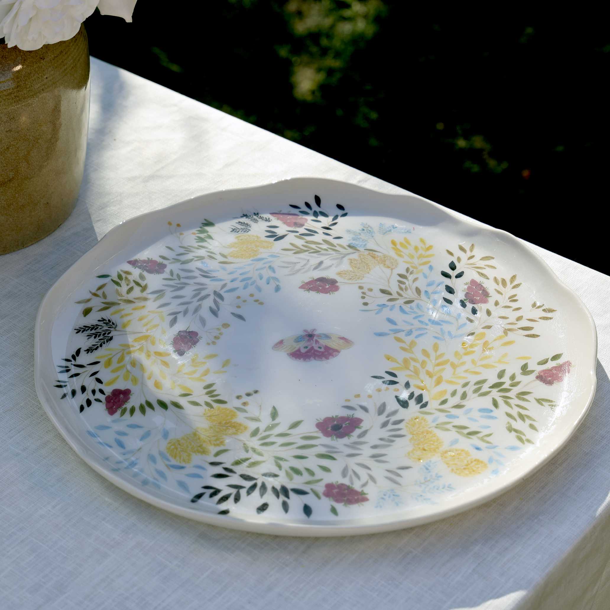 Descubre esta bandeja de cerámica, hecha a mano en España, repleta de flores y frutas con una preciosa mariposa como elemento central. Es como llevar un vibrante jardín a tus mesas.