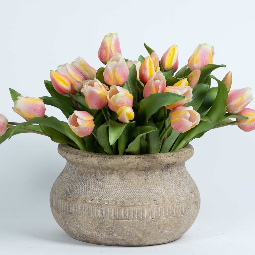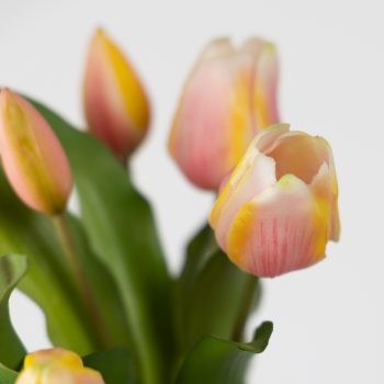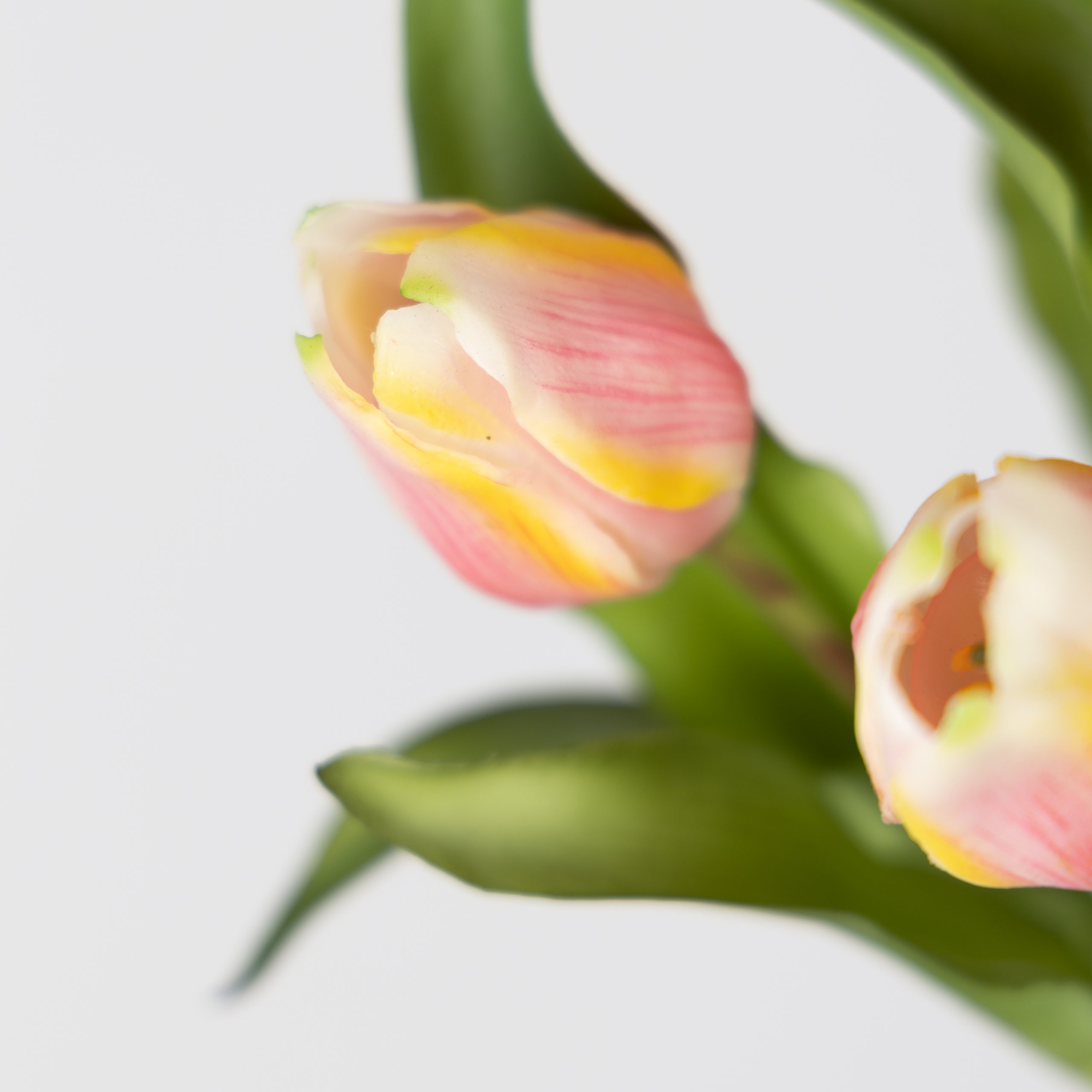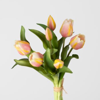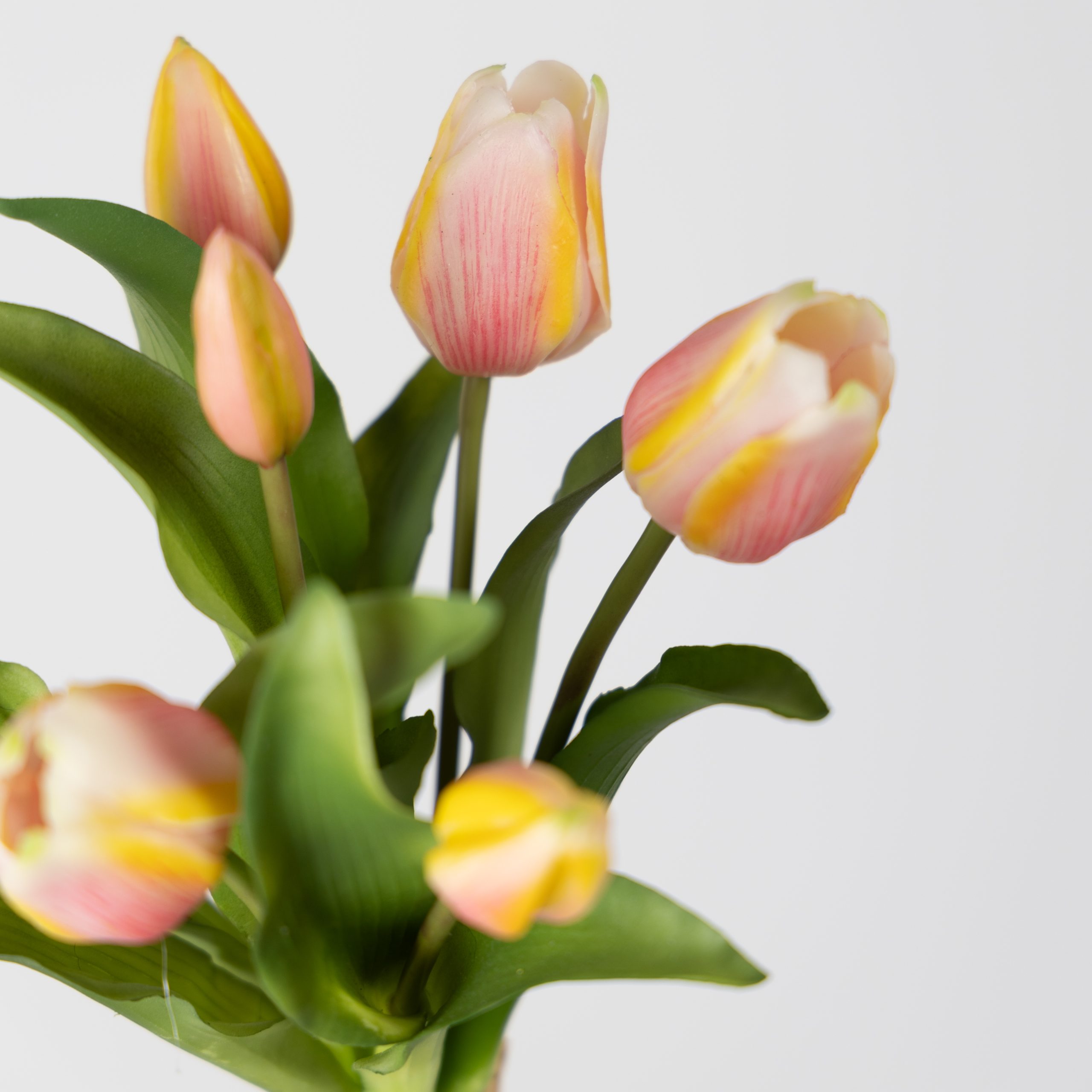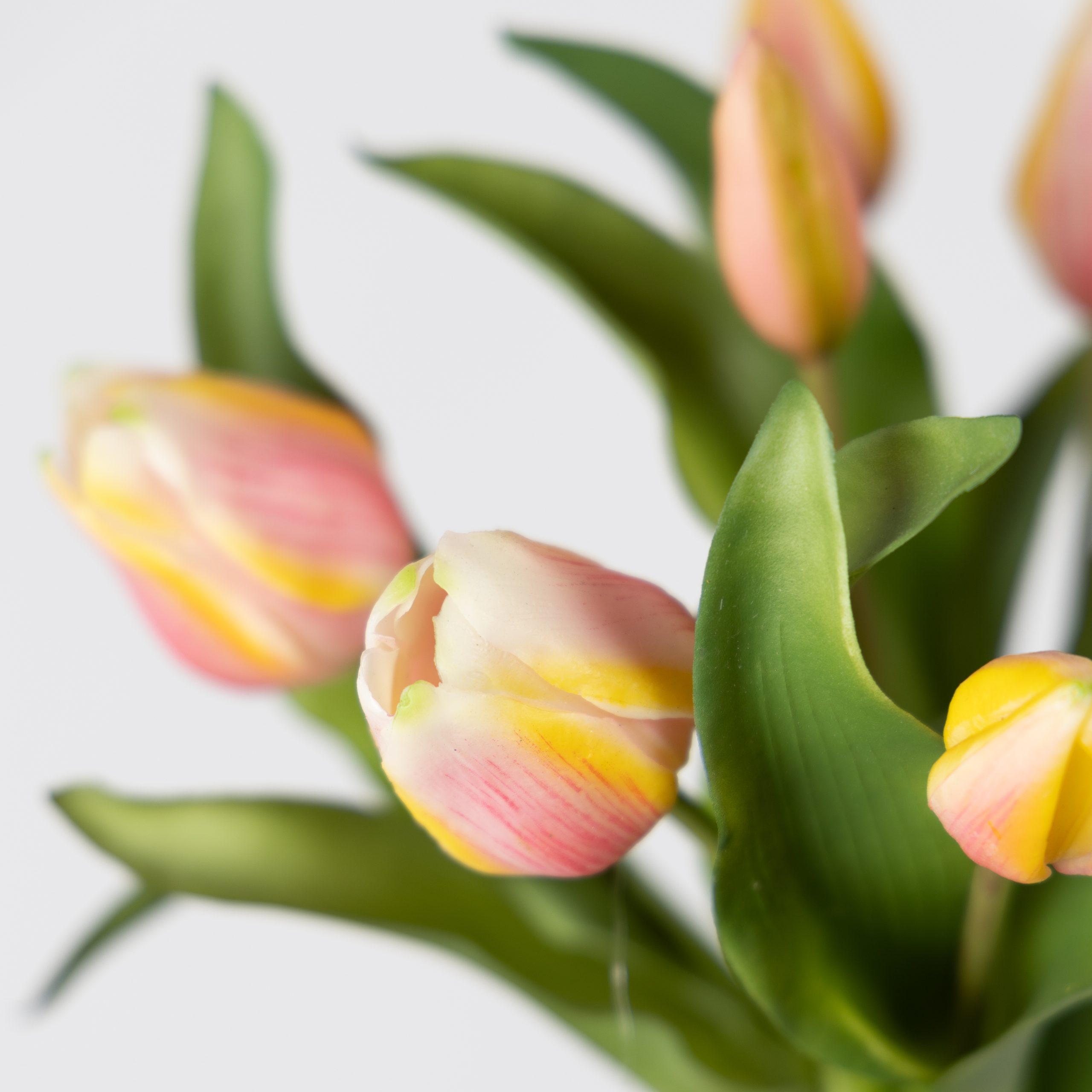Descubre la belleza de nuestro manojo de tulipanes mixturizados, compuesto por 7 tulipanes real touch, fabricados con látex para proporcionar una textura increíblemente natural al tacto. Confeccionados con una altura de 31 cm, este ramo presenta tulipanes en tonos cálidos de rosa y amarillo, creando un efecto degradado que aporta luminosidad y alegría a cualquier espacio. Este manojo es perfecto para colocarlo en un jarrón de poca altura, y cuantos más manojos utilices, más exuberante será el ramo. Puedes mezclarlos con otros de nuestros manojos de tulipanes artificiales hiperrealistas para crear un jarrón lleno de color y vida.