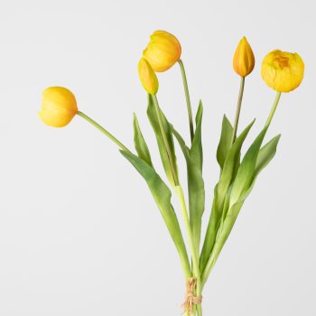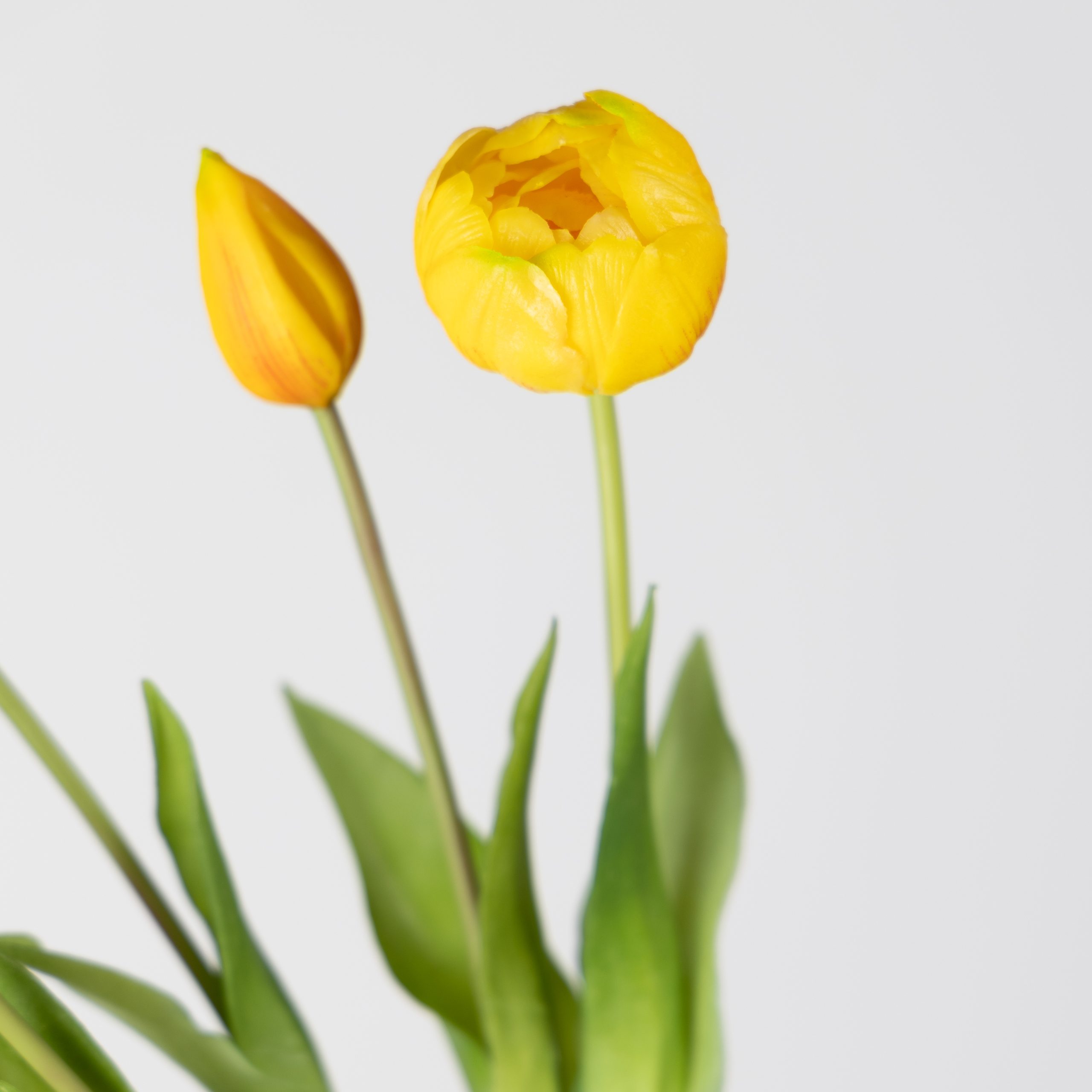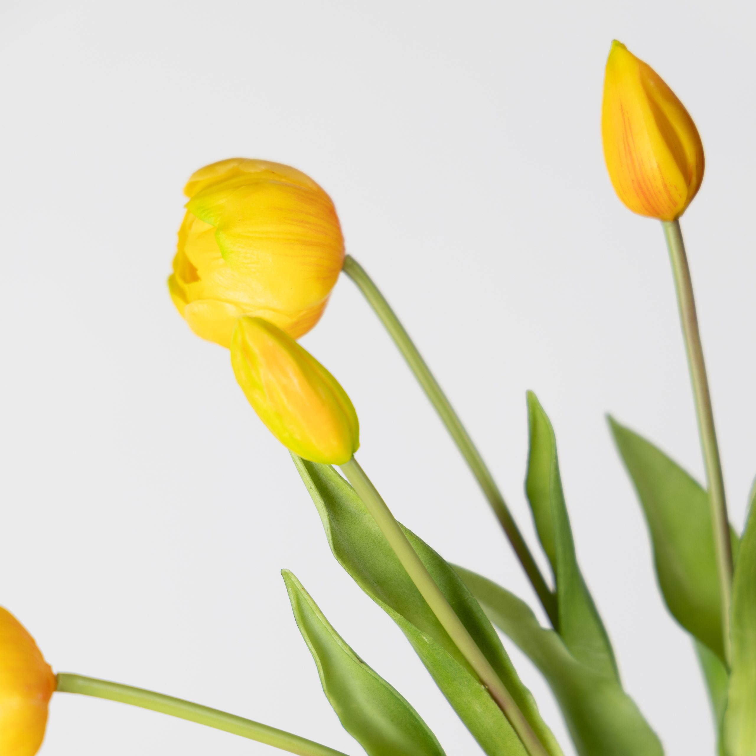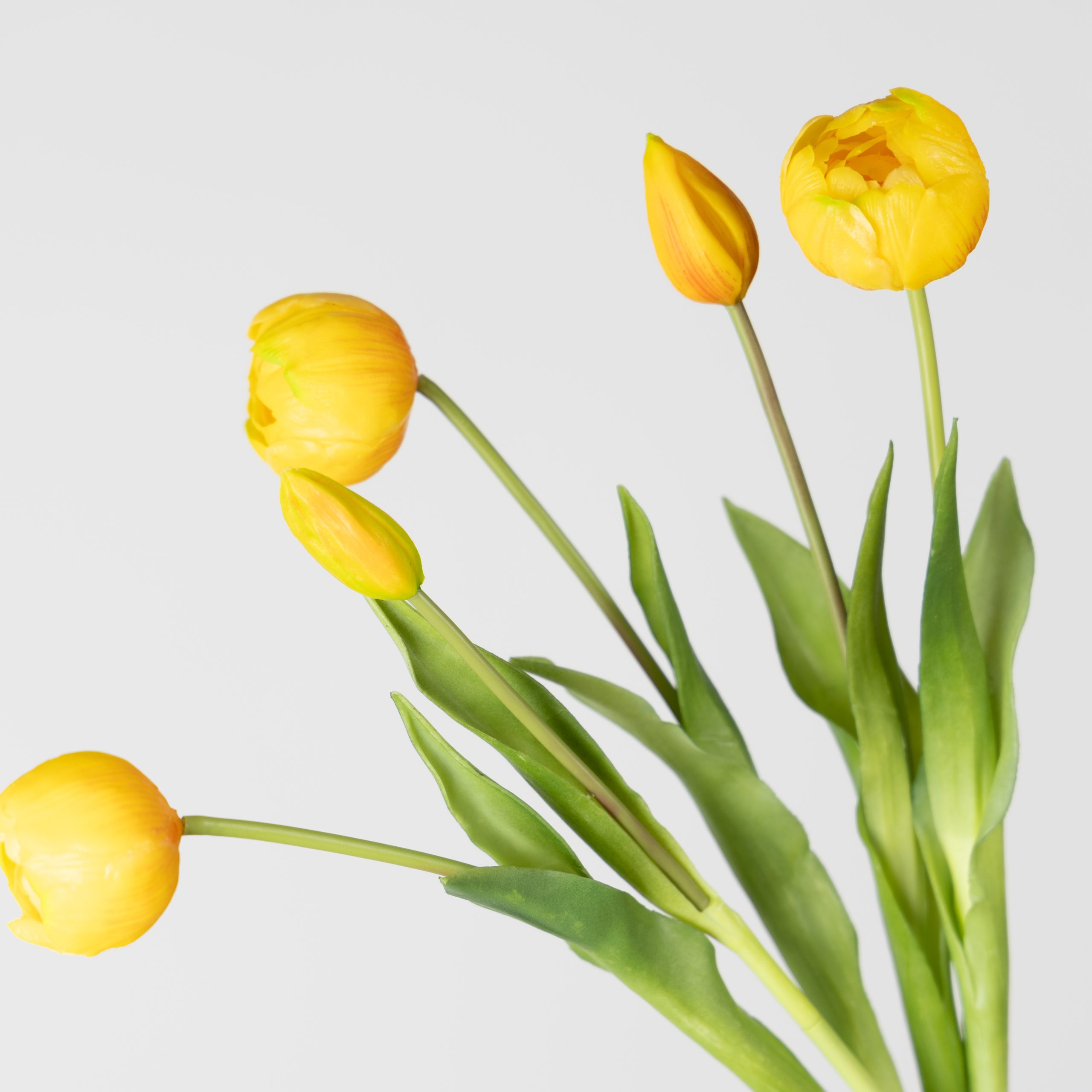 Ilumina tu hogar con nuestro manojo de tulipanes redondos amarillos, que incluye 5 tulipanes artificiales real touch, elaborados con látex para ofrecer una textura increíblemente natural al tacto. Con una altura de 45 cm, estos tulipanes destacan por su vibrante color amarillo, que aporta alegría y energía a cualquier espacio.