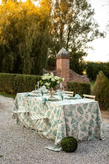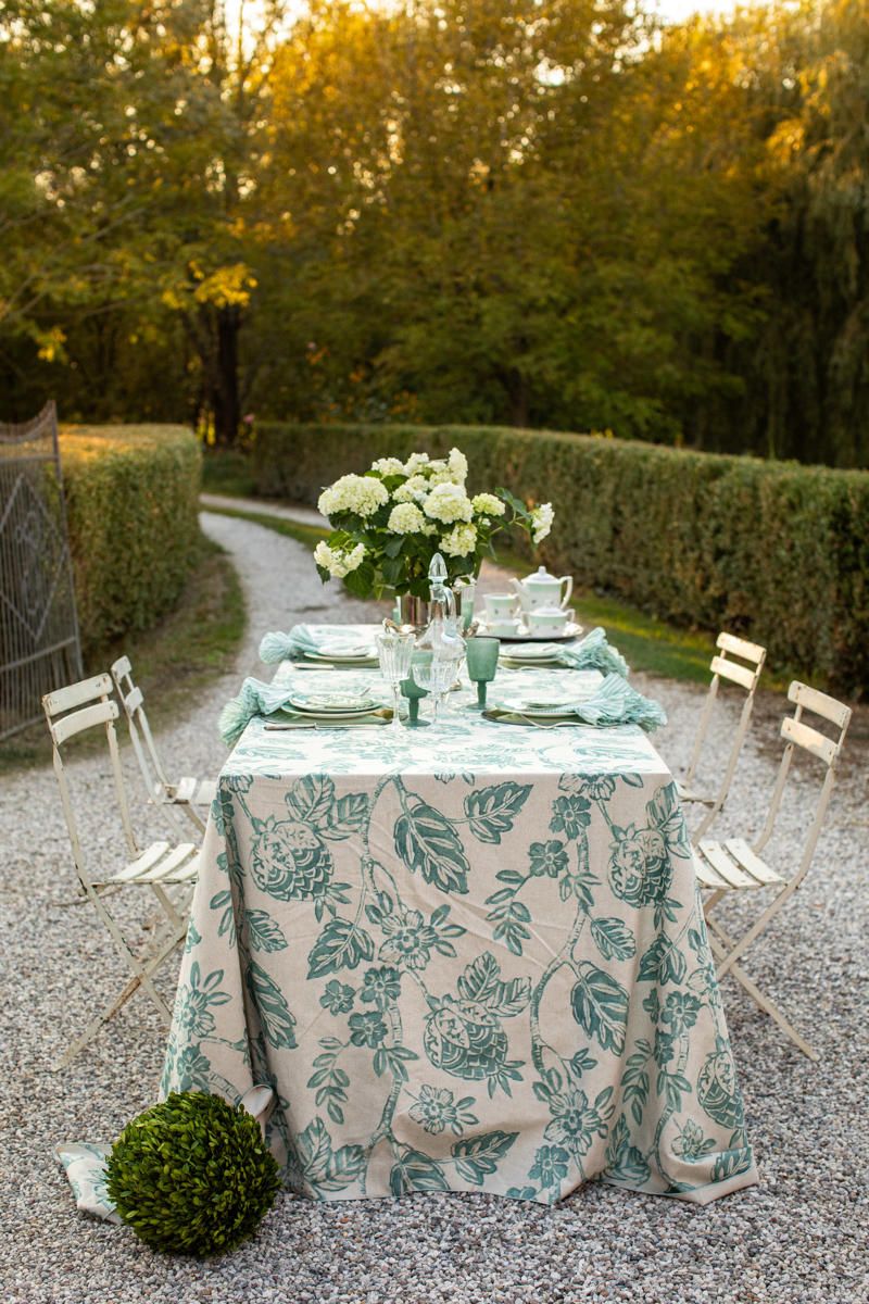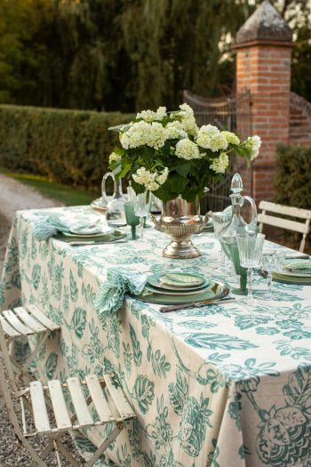 Nuestro precioso mantel Aqua Blossom es la pieza central de cualquier velada.