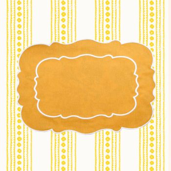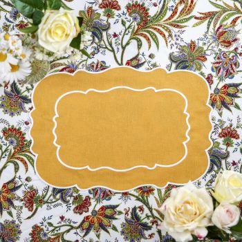 Elegante mantel individual color mostaza, confeccionado al 100% en lino resinado anti-manchas. Añade un toque de encanto con la forma más bonita y práctica de poner tus mesas.