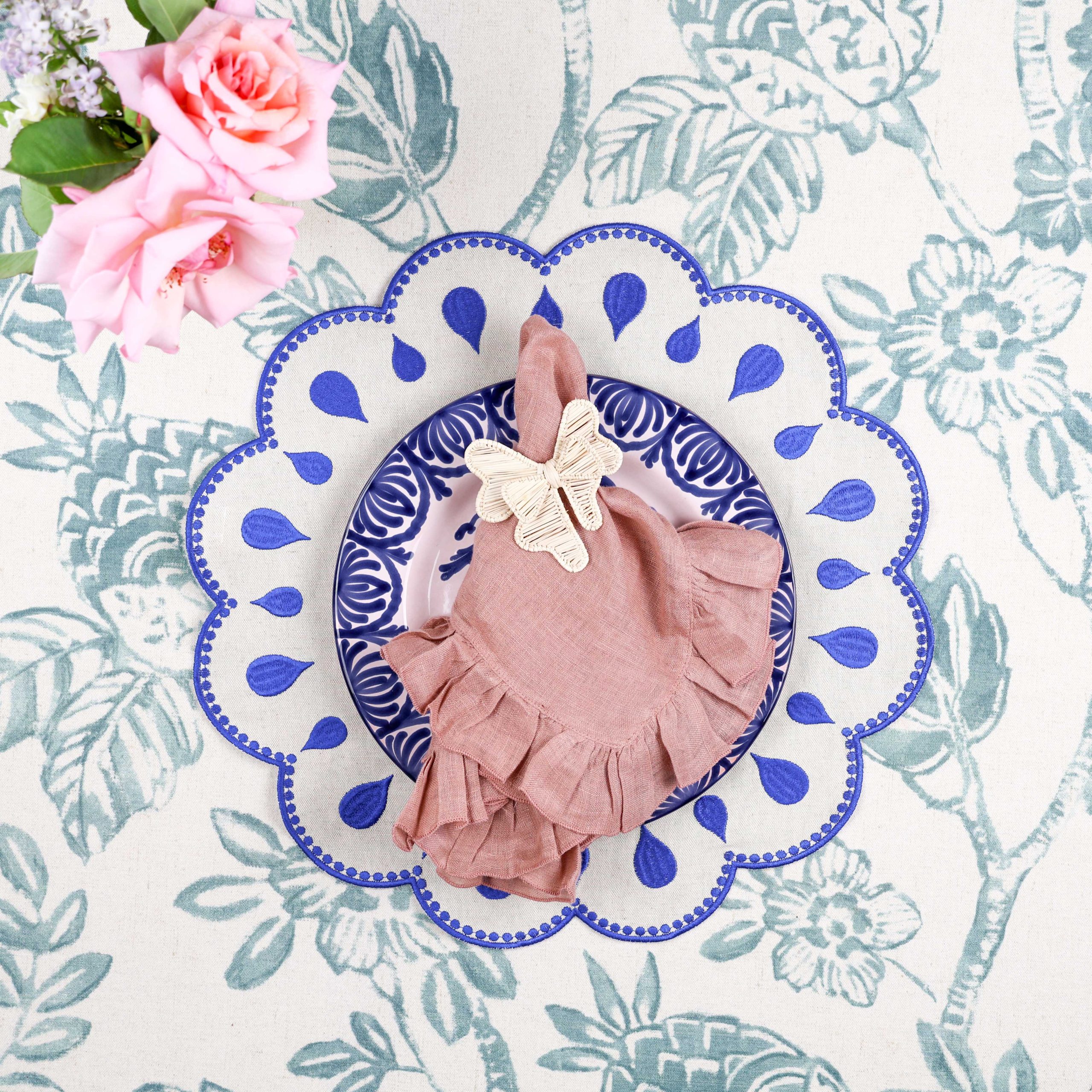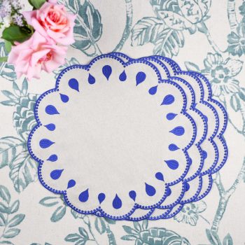Nuestros manteles individuales Pétale Bleu llenara de elegancia tus mesas con sus pequeños y delicados pétalos azules bordados en los bordes.