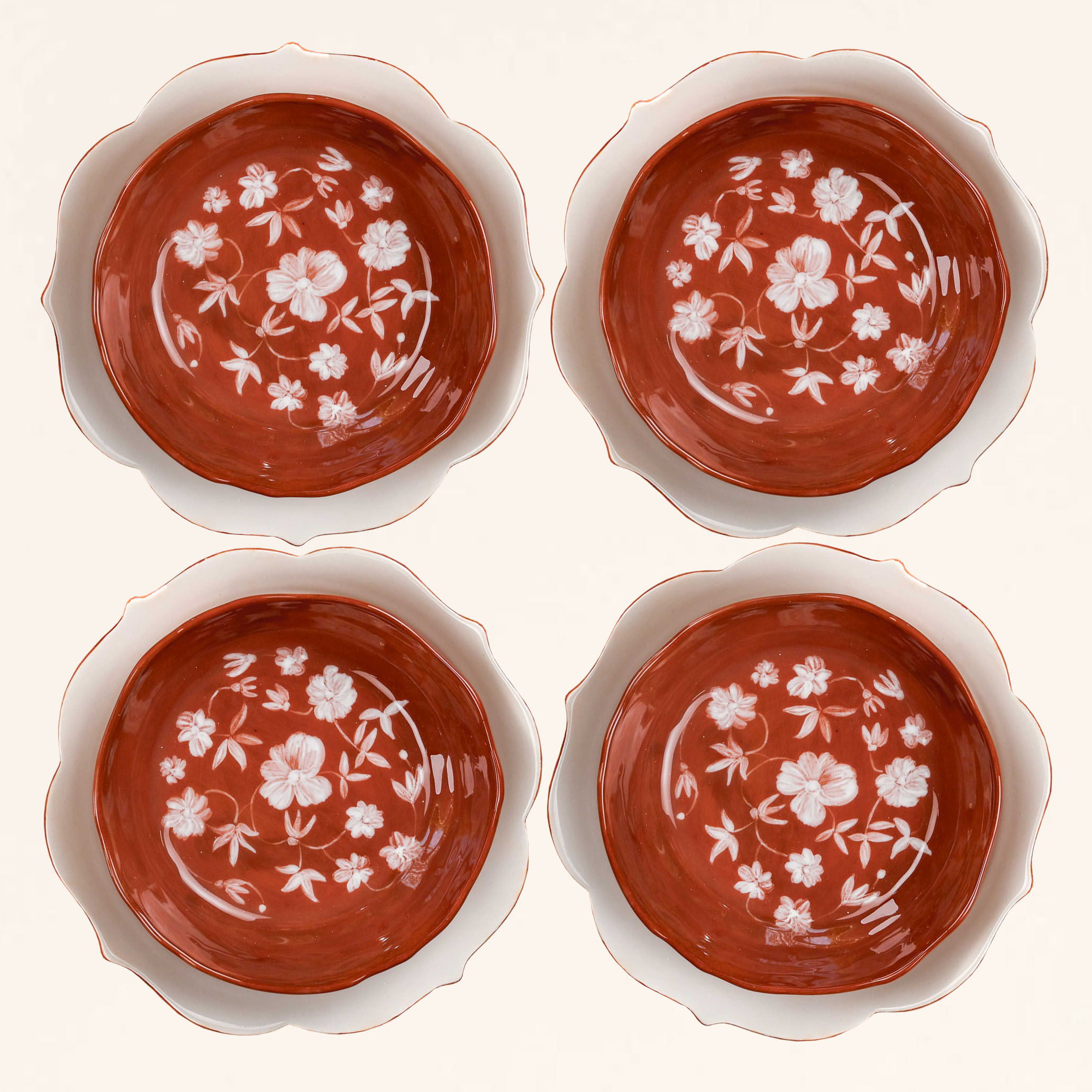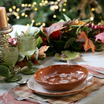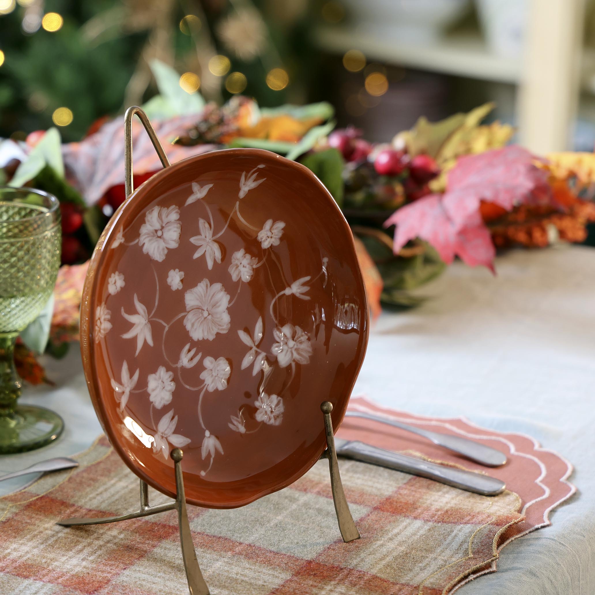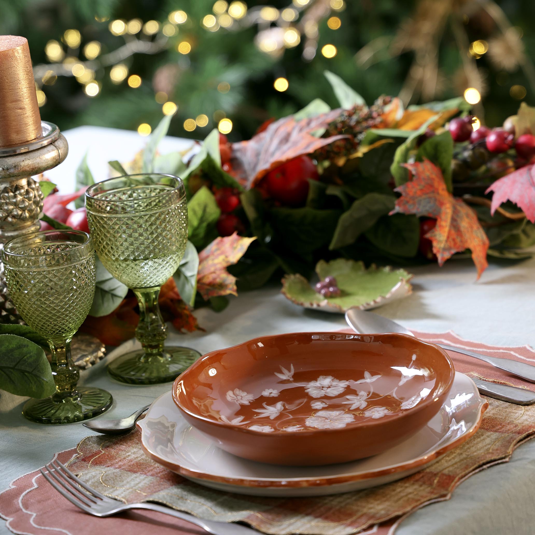 La belleza artesanal se despliega en cada delicada flor pintada a mano que adorna estos preciosos platos color caramelo. Fabricados artesanalmente 100% en España, este set es la elección perfecta para todas las ocasiones. Su elegancia y encanto te transportarán a tu propia campiña en cada mesa.