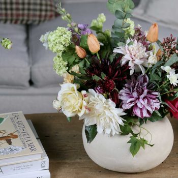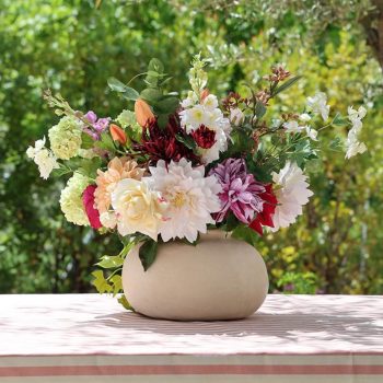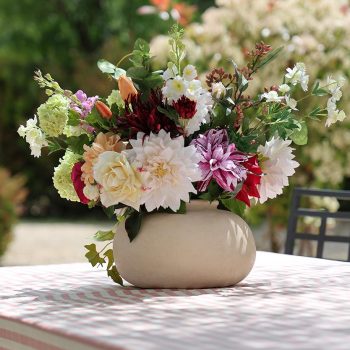 Te presentamos nuestro ramo Amélie. Nos evoca a un paseo lento por un bosque otoñal. Es cálido y reconfortante. Repleto de dalias blancas y malva, tulipanes naranja, eucaliptus, bolas de nieve, lúpulos, rosas, lilas… Fabricadas en materiales exclusivos que te harán sentir que estás tocando flores recién cortadas. Este arreglo floral te llegará en este precioso jarrón de cerámica en tonos beige. Un ramo ideal para complementar cualquier rincón de tu hogar.