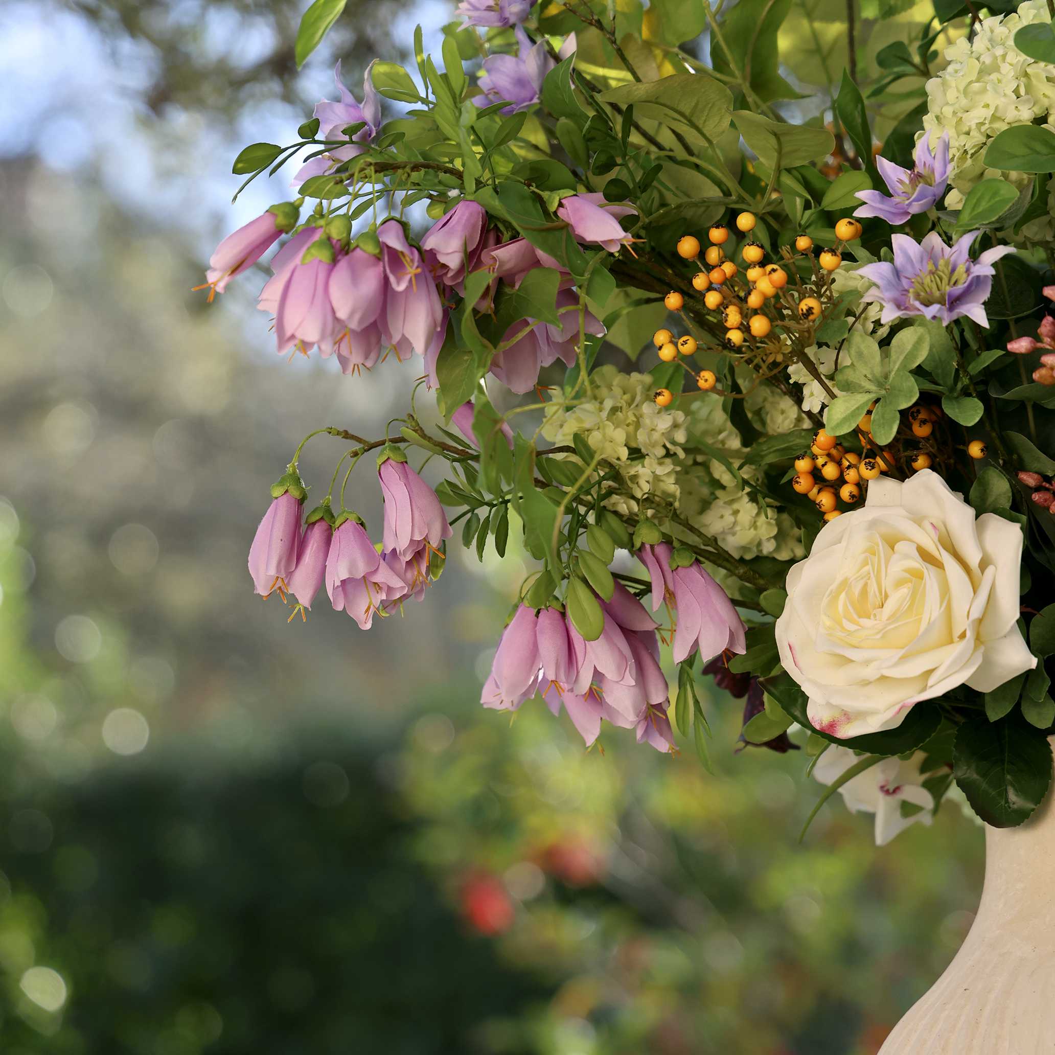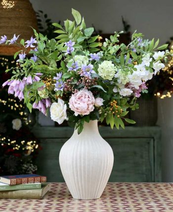 Te presentamos este precioso ramo, Eloise. Si nos preguntarás lo que nos evoca, la respuesta sería, sin duda, a un paseo por el campo en un día de sol. Lleno de hojas verdes, bayas naranjas, peonias rosas, rosas blancas, bolas de nieve y campanulas, fabricadas en materiales exclusivos que te harán sentir que estás tocando flores recién cortadas. Este arreglo floral te llegará en este precioso jarrón de cerámica tallada en tonos crema. Un ramo ideal para complementar tu hogar y llenarlo de luz.