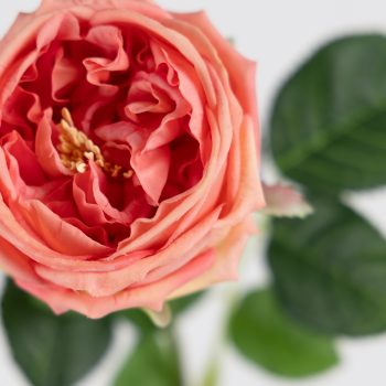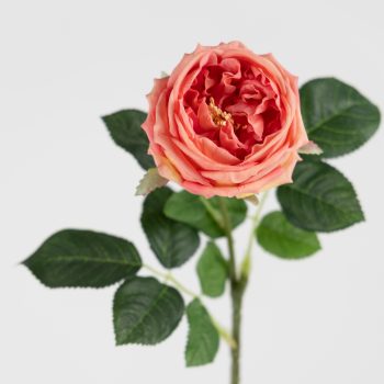El tallo está adornado con espinas simuladas que aportan autenticidad sin riesgo de pinchazos, y está complementado por hermosas hojas dentadas en un precioso verde que realzan el color rosa de la flor.