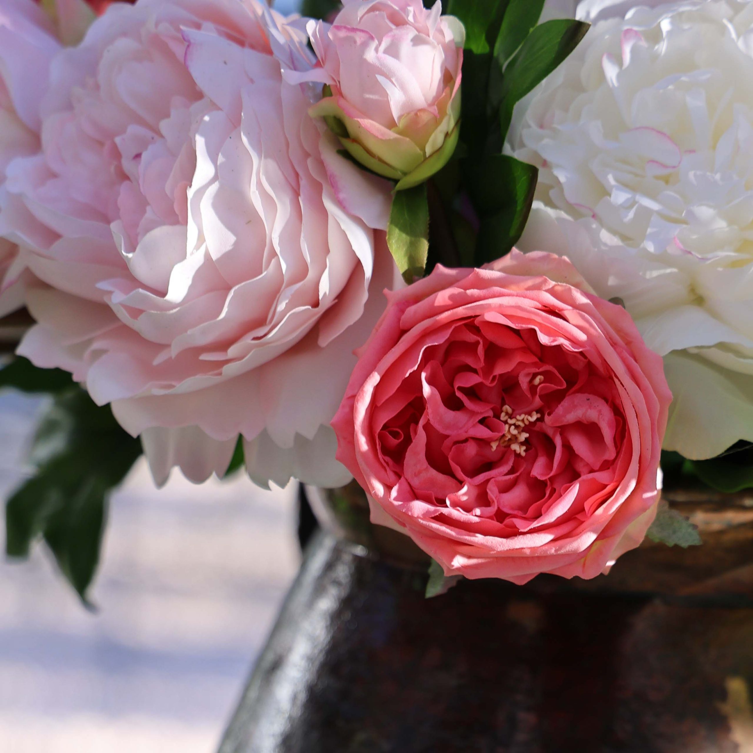 Déjate cautivar por la belleza de nuestra rosa English Rose Rosa. Con una altura de 59 cm, esta flor destaca por su copa amplia, romántica y profunda, formada por numerosos pétalos que le otorgan un toque exuberante y elegante. Su tono rosa se intensifica en el centro con un color más vibrante, mientras que los bordes adoptan un suave y sutil tono rosa claro. Cada pétalo está meticulosamente diseñado con material de látex, formando parte de nuestra exclusiva colección real touch, lo que proporciona una textura increíblemente suave que simula la frescura de una flor recién cortada.