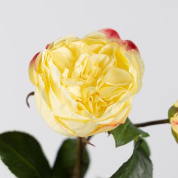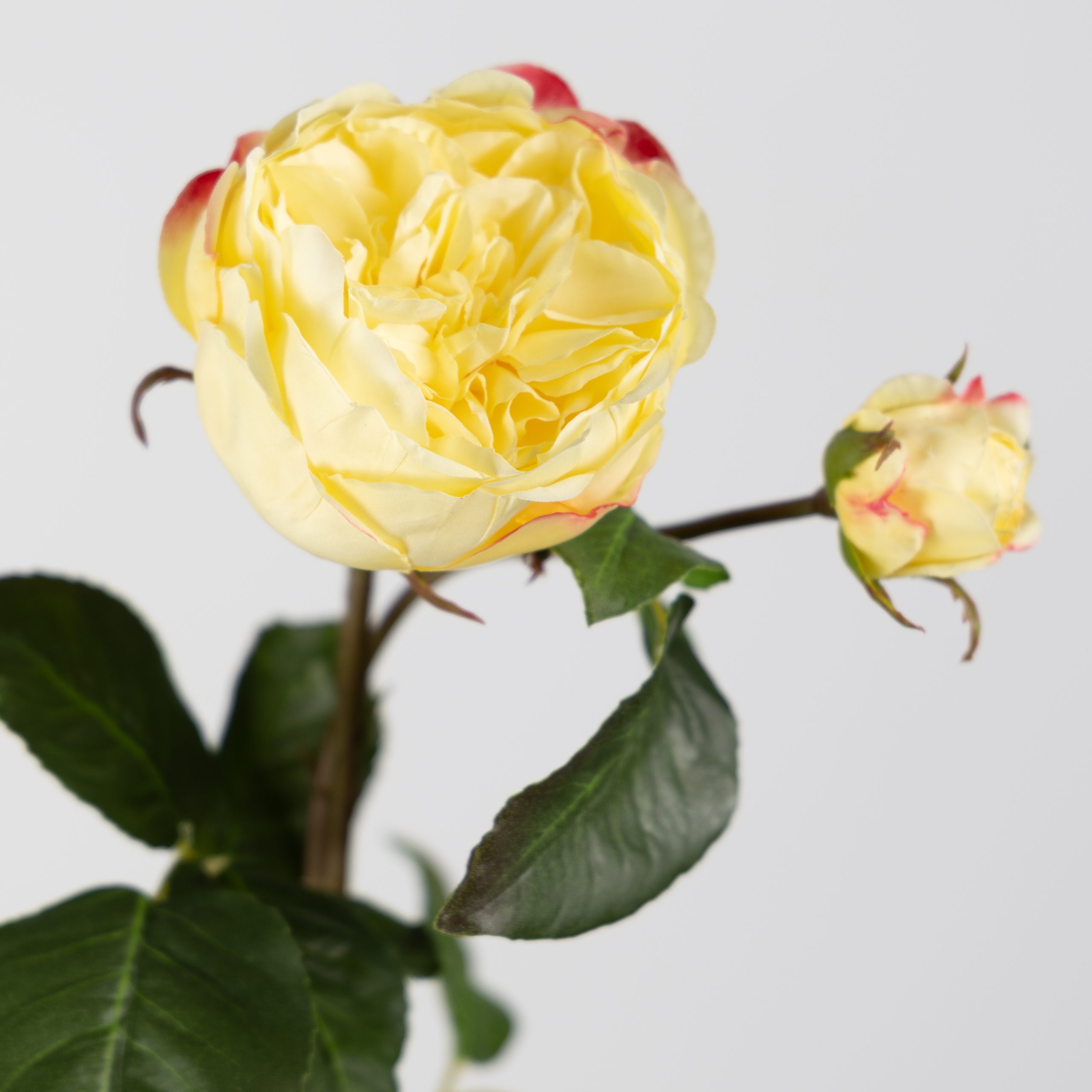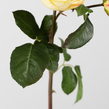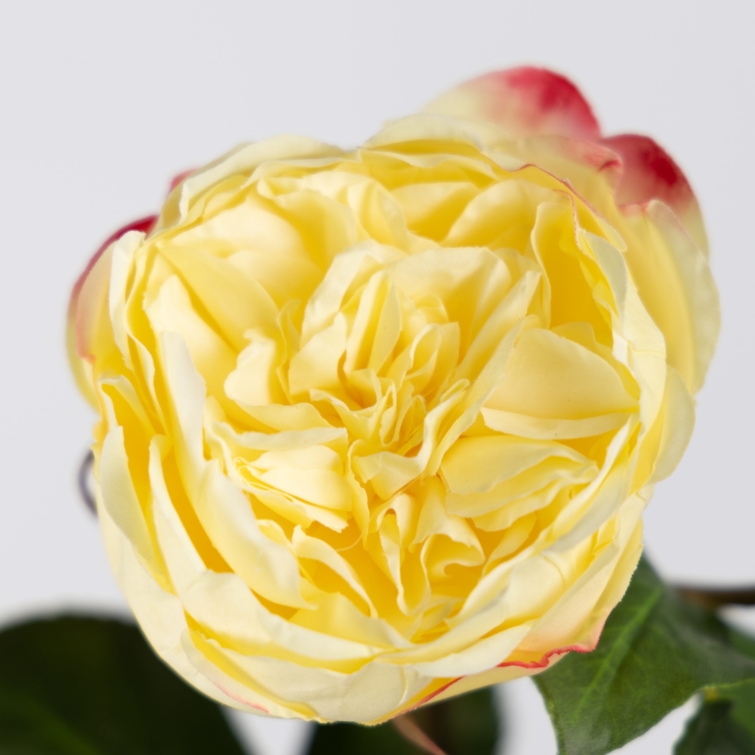 Descubre la elegancia de nuestra Rosa Queen Amarilla. Con una altura de 55 cm, esta flor es un verdadero tributo a la sofisticación y la delicadeza. Su suave tono amarillo, realizado por pinceladas rosadas en los bordes, captura la luz de una manera que resalta cada una de sus capas de pétalos. Diseñada y fabricada con tela de la más alta calidad, esta rosa ha sido meticulosamente creada para reflejar la perfección en cada detalle. Las capas de tela permiten una elaboración exquisita, donde cada pétalo ha sido diseñado para ofrecer un realismo sin igual.