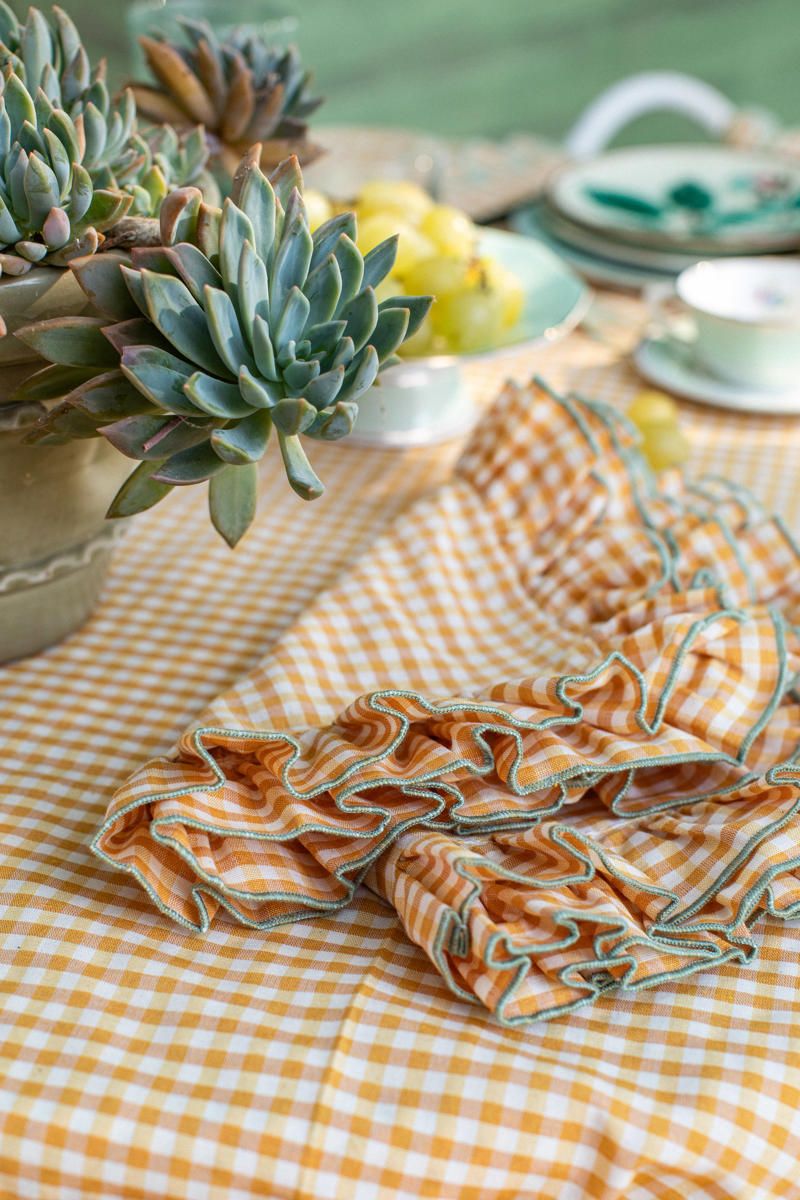 Nuestra colección Riviere presenta estas servilletas de algodón de vichy amarillo con risueños volantes bordados a mano. Este trabajo artesanal será una pieza central en tus mesas. Las servilletas Riviere están disponibles en diez colores que te permitirán embellecer las mesas con infinitas opciones.