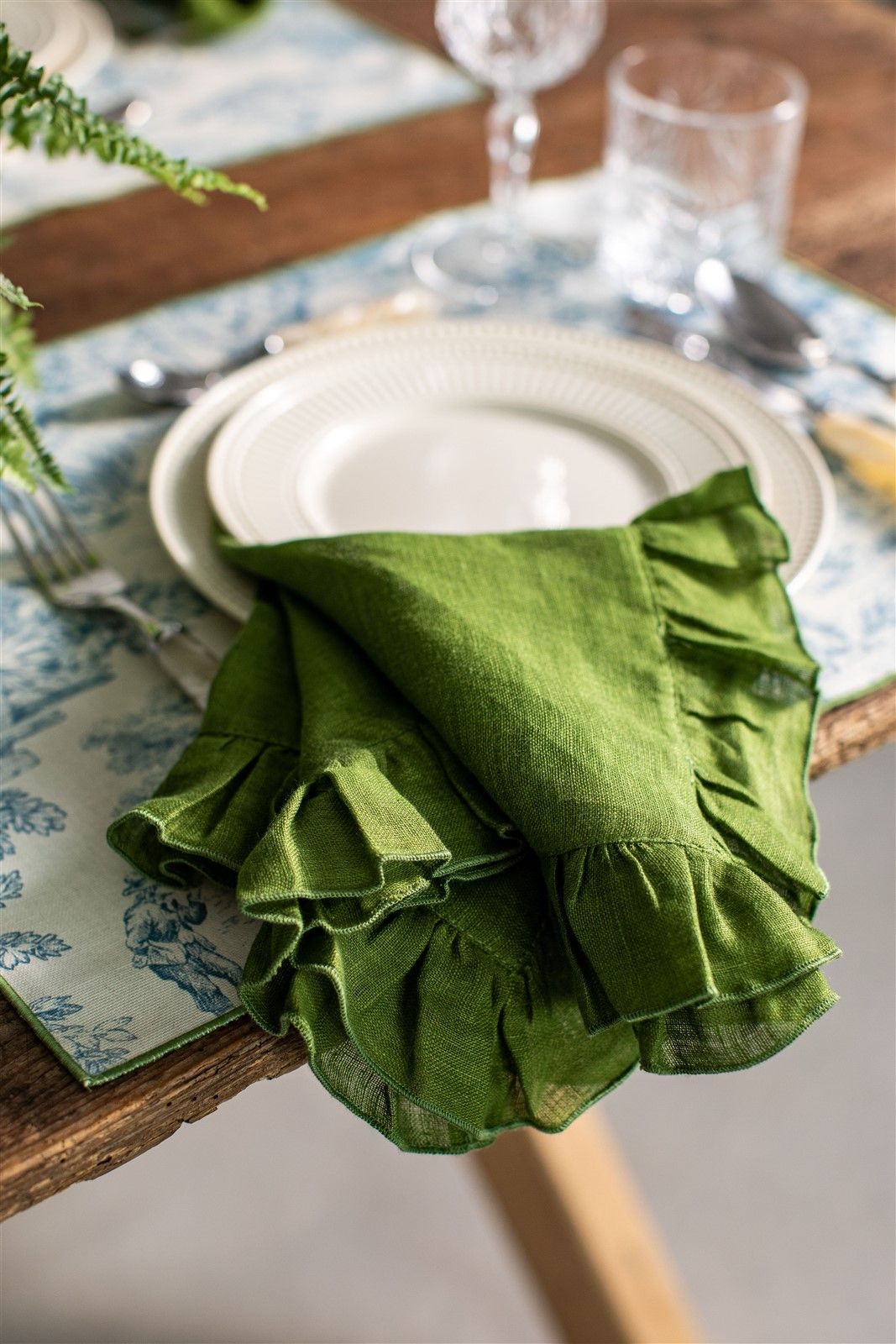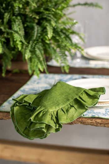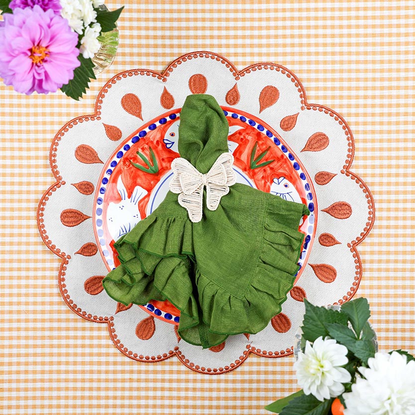 Nuestra colección Riviere presenta estas servilletas de lino color verde helecho con risueños volantes bordados a mano. Este trabajo artesanal será una pieza central en tus mesas. Las servilletas Riviere están disponibles en 10 colores que te permitirán embellecer las mesas con infinitas opciones.