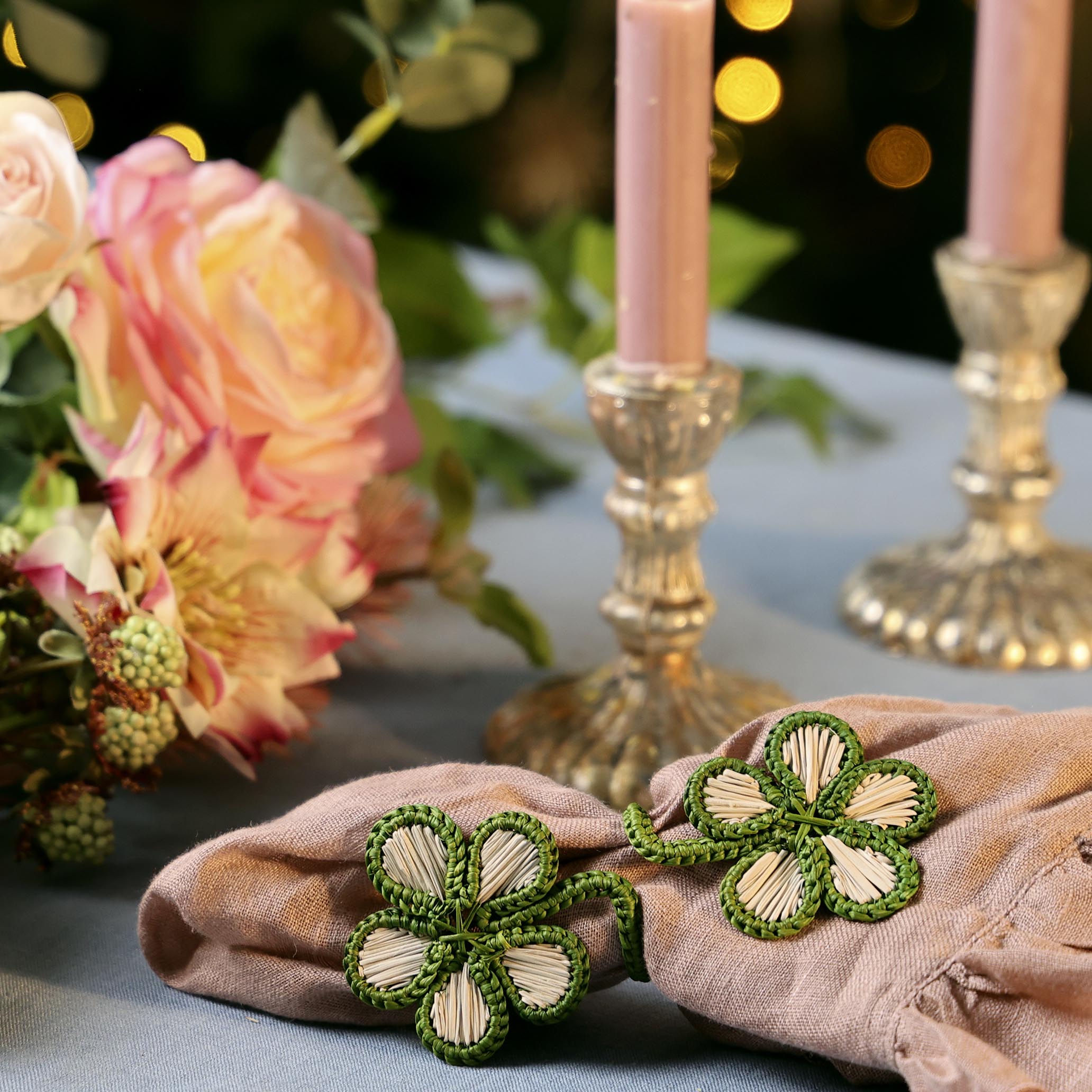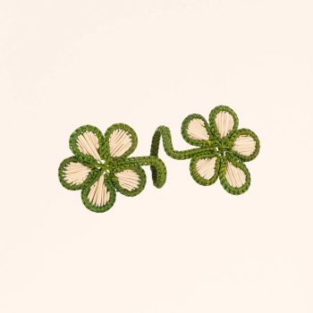 Nuestra colección Blossom de fibras naturales presenta este servilletero de flores cruzadas tejido a mano con palma de iraca por artesanas utilizando una técnica tradicional.