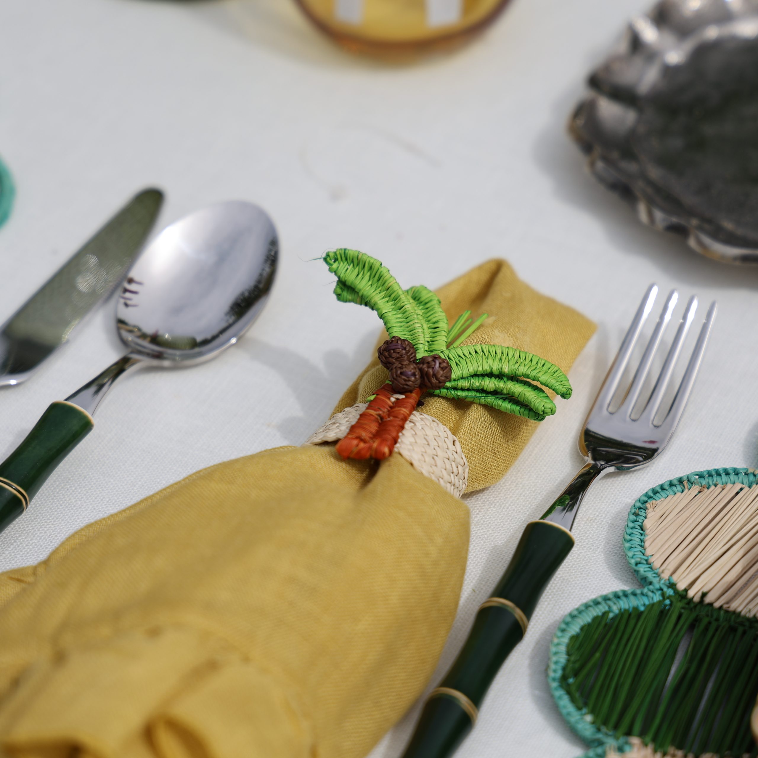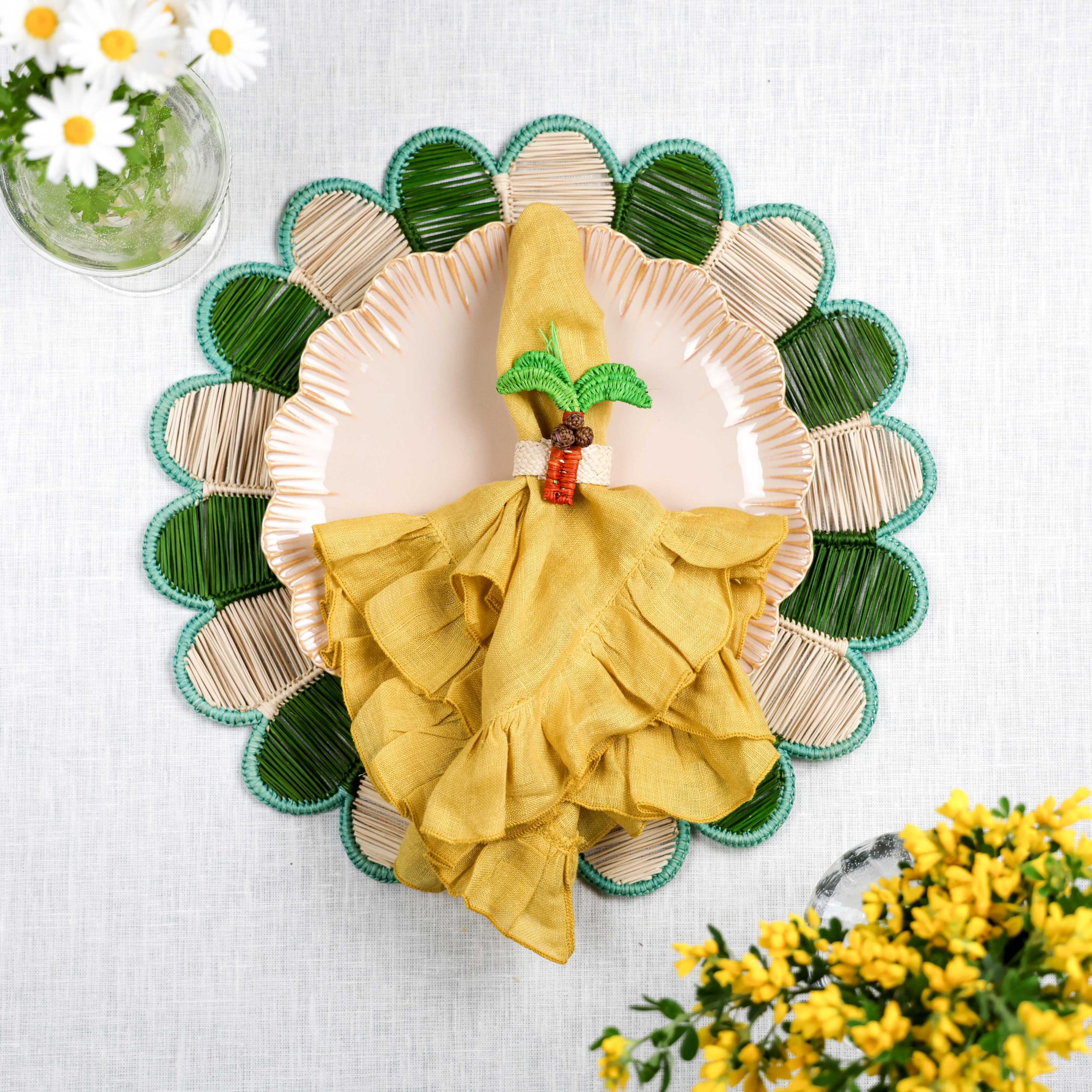 Nuestra colección Blossom de fibras naturales presenta este servilletero de palmera tejido a mano con palma de iraca por artesanas utilizando una técnica tradicional.