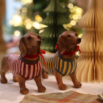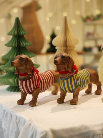 Con su jersey a rayas rojas y su mirada curiosa, Britta no es solo una figura decorativa: es pura simpatía en forma de perro salchicha. Hecho en resina y pintado a mano con esmero, cada ejemplar presenta pequeñas variaciones que lo convierten en una pieza única.