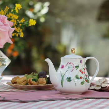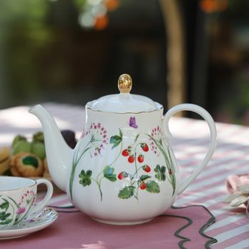 Preciosa tetera de porcelana fina de alta calidad con un delicado diseño que evoca a un precioso y mágico jardín y con un elegante filo dorado decorando su borde.